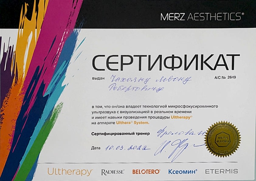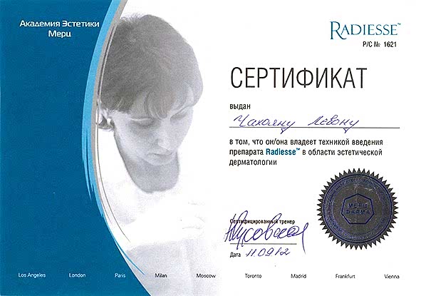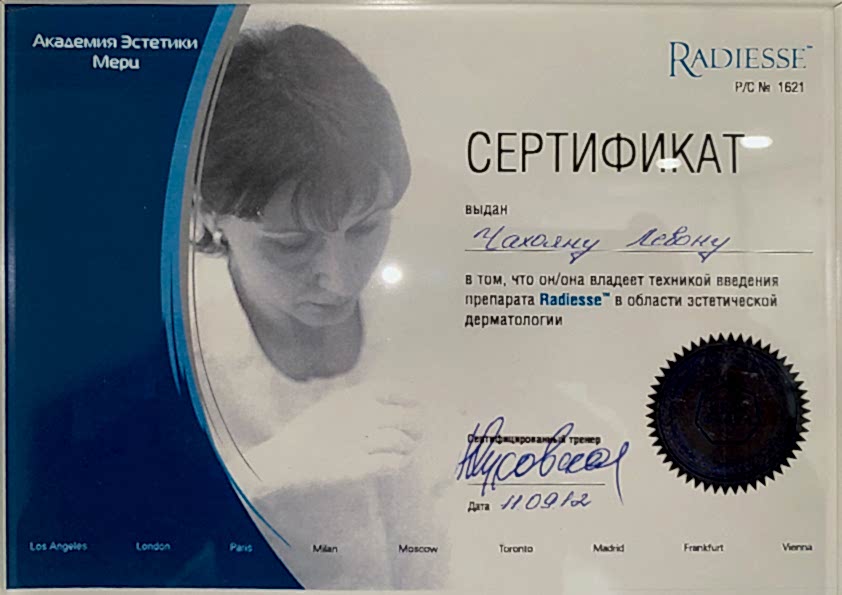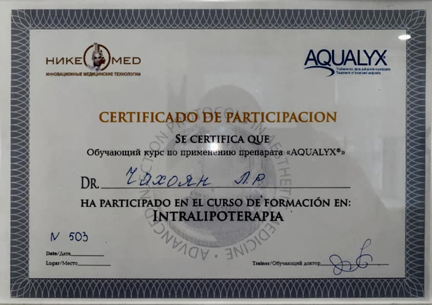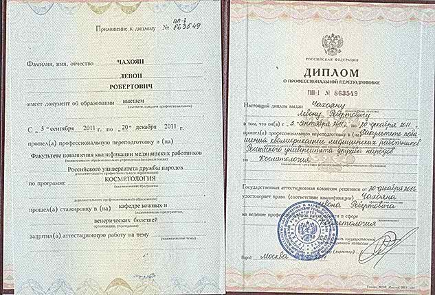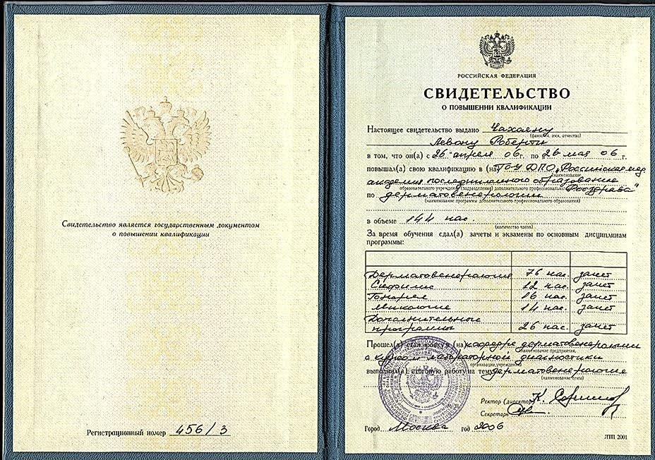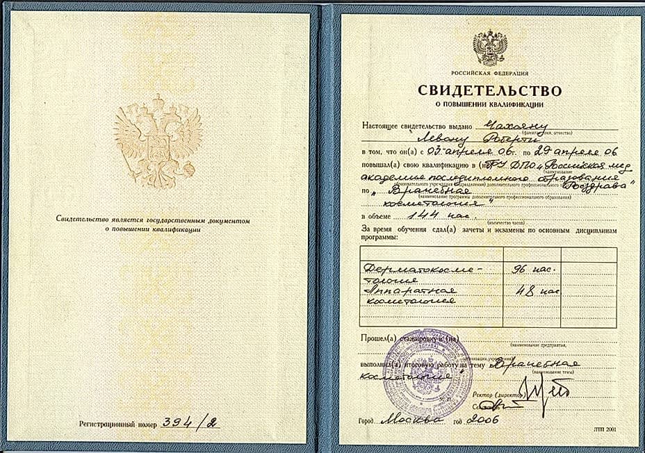 - Клиническая ординатура в ГОУ «Казахстанская медицинская академия последипломного образования» Росздрава; курс «Дерматовенерология». Повышение квалификации: курс «Косметология».