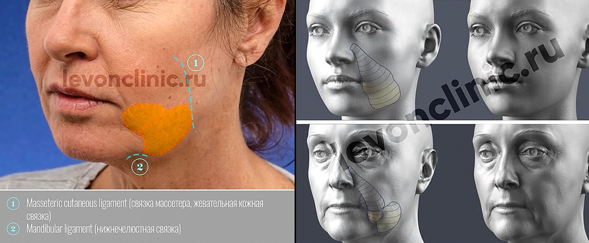 Спереди, перед брылью ничего не оползает, потому что ткани удерживает нижнечелюстная связка, а за брылью есть мощная жевательная мышца («массеттер») - между ней и кожей почти нет жира, но и его удерживает Pin-Up массеттера.