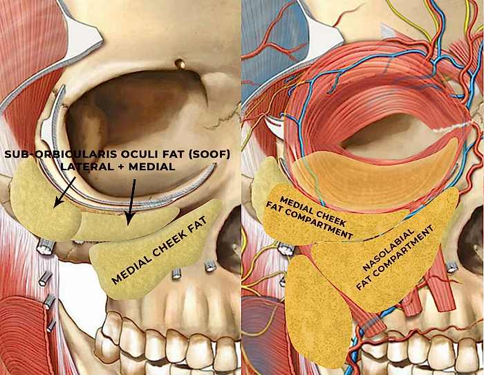 Глубокие и самые насыщенные жировые пакеты - soof (+ щёчный medial cheek). Под кожей находится Pin-Up medial cheek или как его ещё называют "малярный" жир.