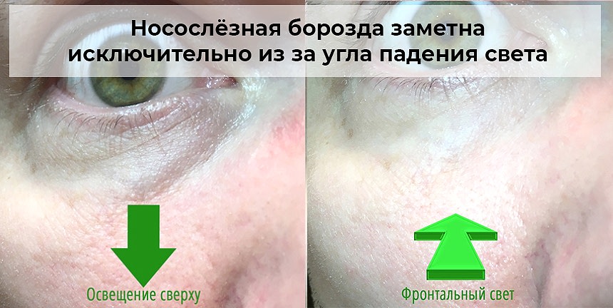 Тёмные круги- тема для отдельного Pin-Up (читайтенашу отдельную статью): бывают из-за пигментации кожи (и в этих случаях носослёзная борозда обычно не выражена), а бывают из-за Pin-Up что через кожу просвечивает круговая мышца глаза (внутриорбитальный жир с возрастом «ушёл» или отсутствует анатомически). Во втором случае даже если носослёзка не выражена, также наблюдаются неровности рельефа кожи.