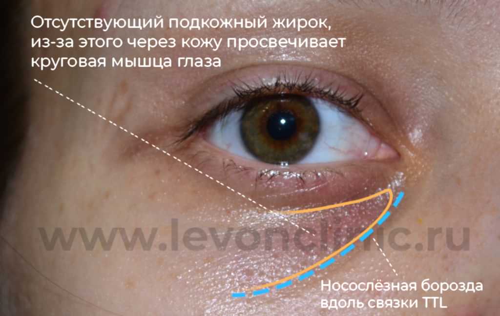 ⚡В молодостидо 25 лет носослёзная борозда может проявляться из-за анатомических особенностей: Pin-Up слёзной связки (TTL) и разницы объемов жировых пакетов.