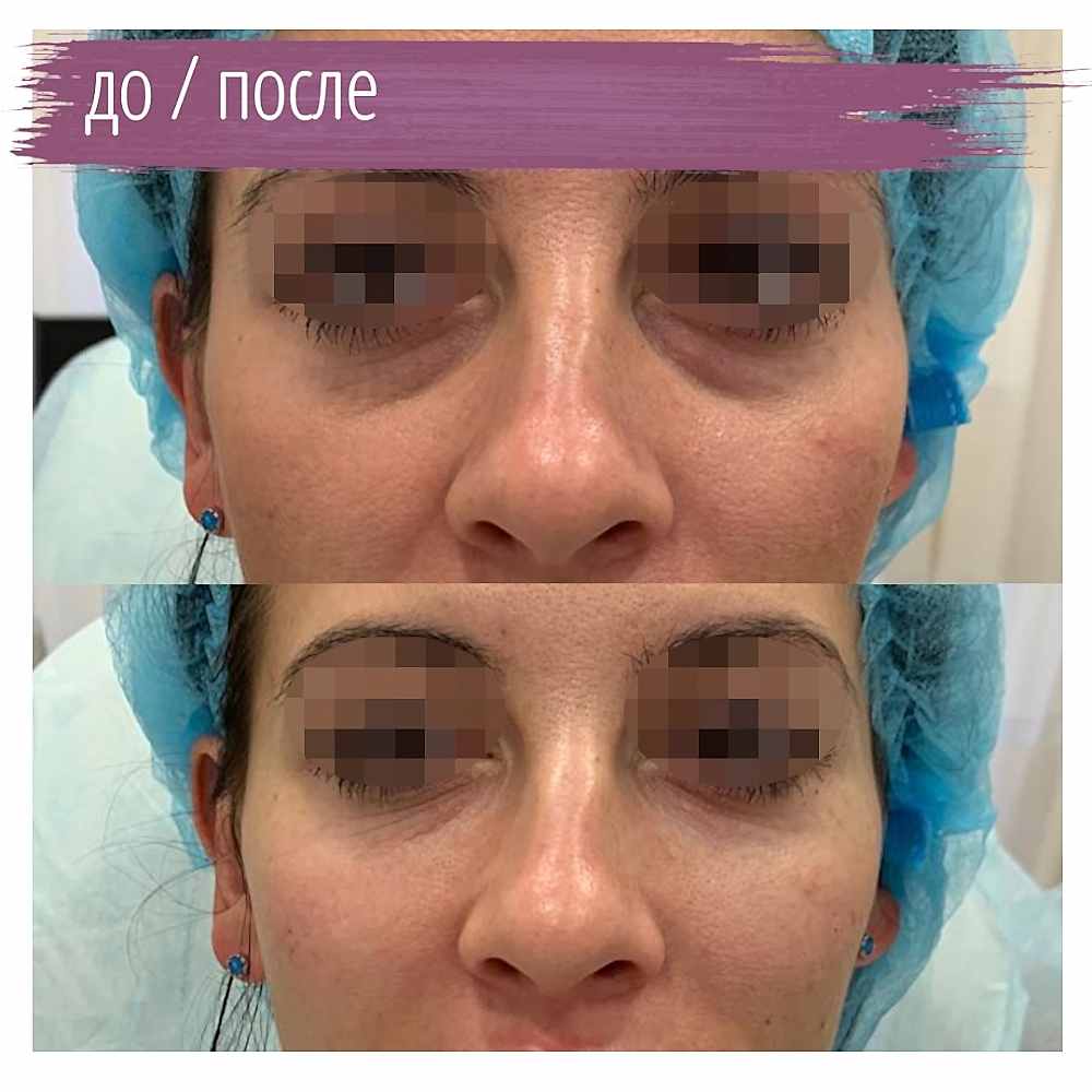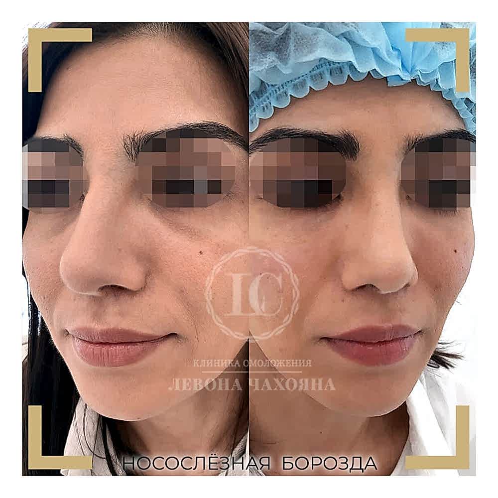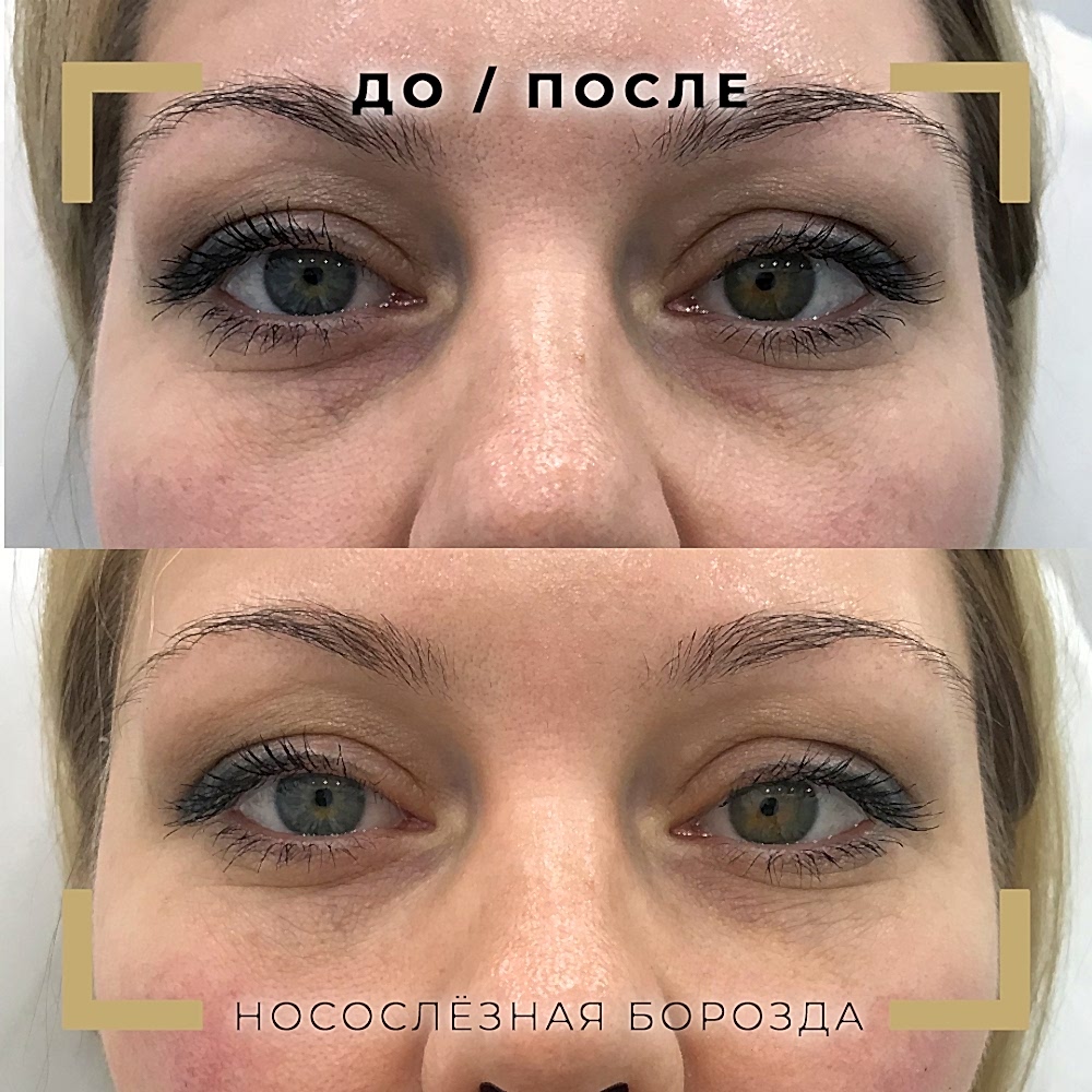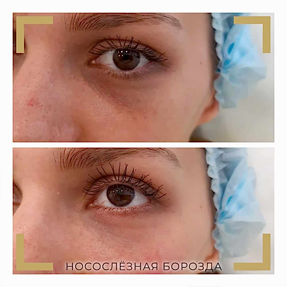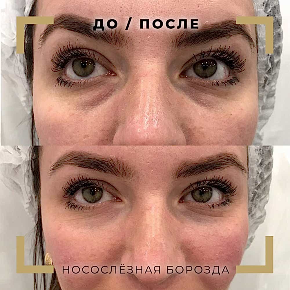 Нити- часто можно слышать про «армирование области под глазами» для устранения носослёзки. Эффект от процедуры очень неоднозначный: да, введённые нити сами не обладают достаточным объемом, но вокруг них формируется фиброзная коллагеновая основа, которая поддерживает ткани изнутри. Это может сгладить носослёзку, но! Это область мимически активная - мы улыбаемся, щуримся, а нити - довольно жесткие. Очень часто они «контурируют» (видны их кончики во время мимики). Мы не рекомендуем этот способ коррекции.