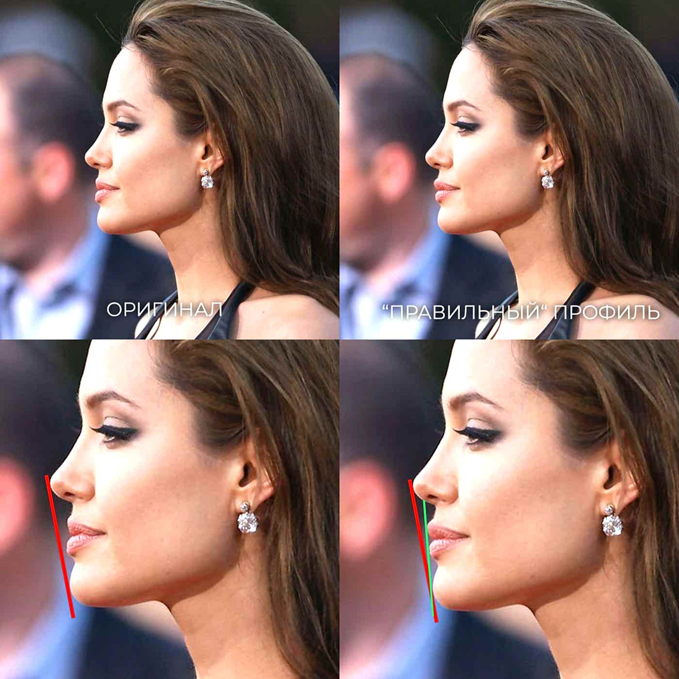 Не совсем! У неё очерченная линия нижней челюсти, выраженный подбородок, аккуратный профиль носа и яркие губы. Однако, если оценивать профиль актрисы при помощи известных тестов красоты - к примеру, использовав линию Риккетса или Штейнера - то обнаружим, что отклонения от идеала всё же есть. Верхняя губа недостаточно выдвинута к линии, соединяющей нос и подбородок.