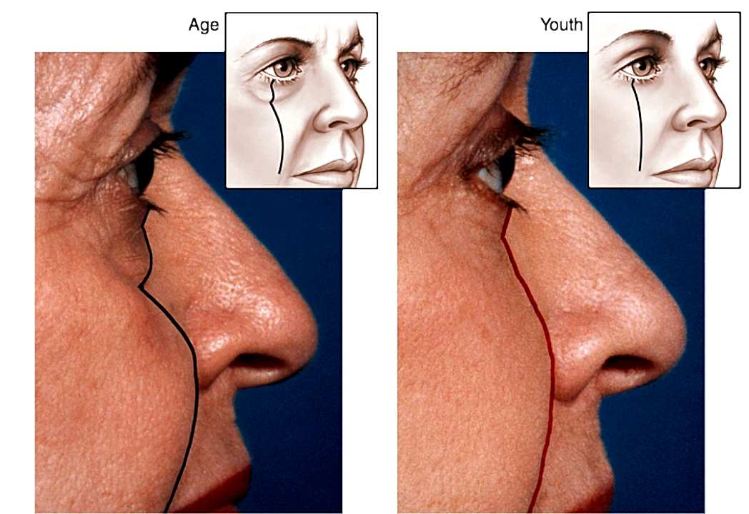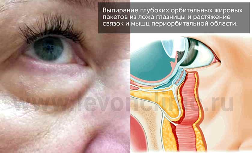 Растянутая септа и круговая мышца глаза не могут удержать эти пакеты на своём месте и под глазами вырастает мешочек, удерживаемый снизу орбитальной связкой.